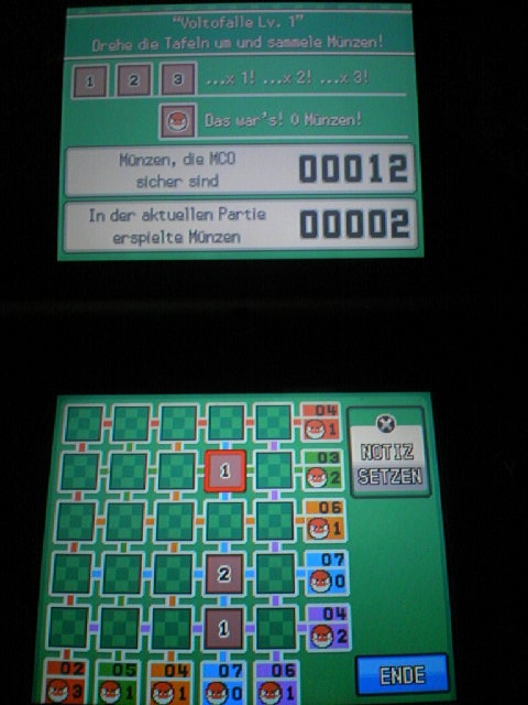 ともあれまずはゲームコーナーで台詞を確認しよう。もしかしたら別バージョンの話だったかも…… 着いた。Spielhalleというらしい。 さて中へ… ……あれ?民家と間違え…… てない。もっかい中へ… …… ,ィィr-- ..__、j ル! { `ヽ, ∧ N { l ` ,、 i _|\/ ∨ ∨ ゝヽ _,,ィjjハ、 | \ つまり! `ニr‐tミ-rr‐tュ<≧rヘ > 海外版HGSSではスロットマシンが {___,リ ヽ二´ノ }ソ ∠ まったく別のミニゲームに '、 `,-_-ュ u /| ∠ 置き換えられていたんだよ! ヽ`┴ ' //l\ |/\∧ / --─‐ァ'| `ニ--‐'´ / |`ー ..__ `´ く__レ1;';';';>、 / __ | ,=、 ___ 「 ∧ 7;';';'| ヽ/ _,|‐、|」 |L..! {L..l )) | |::.V;';';';'| /.:.|トl`´.! l _,,,l | _,,| , -, ! |:.:.:l;;';';';'|/.:.:.:||=|=; | | | | .l / 〃 )) l |:.:.:.:l;';';'/.:.:.:.:| ! ヽ \!‐=:l/ `:lj 7 | |:.:.:.:.l;'/.:.:.:.:.:.! ヽ:::\:: ::::| ::l / _人人人人人人人人人人人人人人_ > な なんだってー!! <  ̄^Y^Y^Y^Y^Y^Y^Y^Y^Y^Y^Y^Y^Y^ ̄ _,,.-‐-..,,_ _,,..--v--..,_ / `''.v'ν Σ´ `、_,.-'""`´""ヽ i' / ̄""''--i 7 | ,.イi,i,i,、 、,、 Σ ヽ . !ヘ /‐- 、u. |' |ノ-、 ' ` `,_` | /i'i^iヘ、 ,、、 | |'' !゙ i.oニ'ー'〈ュニ! iiヽ~oj.`'<_o.7 !'.__ ' ' ``_,,....、 .| . ,`| u ..ゝ! ∥ .j (} 'o〉 `''o'ヽ |',`i _,,..-<:::::\ (二> / ! _`-っ / | 7  ̄ u |i'/ . |、 \:::::\ '' / \ '' /〃.ヽ `''⊃ , 'v>、 !、\ \. , ̄ γ/| ̄ 〃 \二-‐' //` 詳しい説明は英語版Wikiに譲るとして、 一瞬金銀のカードめくり再来かと思いましたが……簡単に言えばマインスイーパとピクロスを合わせたような全く新しいゲームでした。 ビリリダマのいるパネルを避け、数字の書いてあるパネルを開いていくと、その数字の総乗に等しい数のコインが手に入ります。端の数字は、それぞれの行・列にある数字パネルの総和と、ビリリダマの数を表しています。ビリリダマを開けば当然アウト。 で、このゲーム、コインを賭けないんですよね。賭博が海外の表現規制に引っかかったのでしょうか?…でもDPtまでは普通にスロットマシンを置いてたのに…? ちなみに、部屋右上の男の人が景品を引き換えてくれます。コインケースは初めに話しかけた時に貰えました。 さて。はたしてこのミニゲーム、コイン4000枚も稼げるんでしょうか……? PR TrackbacksTRACKBACK URL : CommentsComment Form |