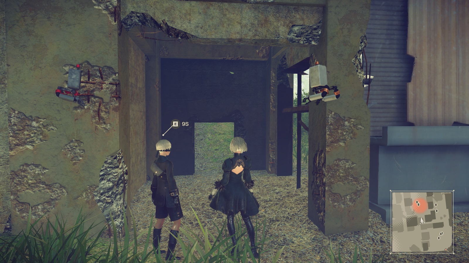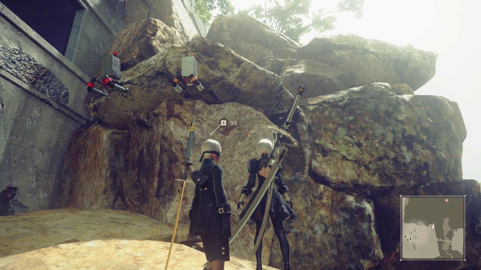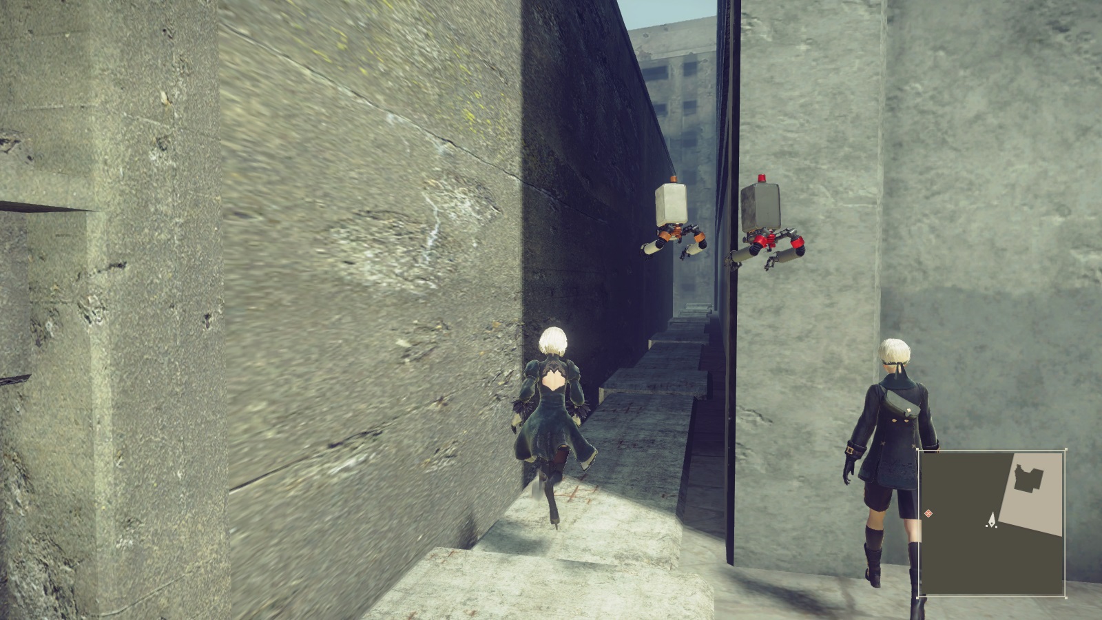 逆説的に言えば、従来型のゲームは「世界の広さの表現に、マップロードが一役買っていた」と言えます。 例としてモンスターハンターシリーズを挙げると、あのゲームの実質的な1マップの広さは、大雑把に言って闘技場10個分もありません。しかし、森丘や孤島全体が本当にそれだけの広さしかないと感じられるでしょうか?少なくとも私はそうは思いませんでした。マップの遠景に加えて、エリアを繋ぐ獣道、川や滝、崖といった地形が、エリアとエリアの間の空間を想像させてくれるからです。 もっと判りやすい例としてはマイナーですが「メトロイドプライム」を挙げることができます。このゲームは惑星の探索をテーマの1つとしており、砂に埋もれた廃墟、溶岩溢れる地下洞窟、一面真っ白の雪原……と多様な景観が見られます。しかしこれらのエリアは高速長大な「エレベーター」によって接続されており、実際には遠く離れている事実をプレイヤーに明示します。 繰り返しになりますが、ゲームデータ上に存在しない「マップ間の空間」の存在をプレイヤーに想像させることは、ゲームの世界の広さを表現する上で重要であったと言えるでしょう。一方でこの広さを実際に描写してみせるのが昨今のオープンワールドゲームです。しかし本作NieR: Automataにはそのような世界の広がりの描写も、描写外の広さを想像する余地も無く、世界が不自然に狭く感じられてしまいました。 また細かい所ですが、ゲーム性より景観のデザインを優先しているキライがあり、プレイヤーに間違ったメッセージを伝えてしまっている箇所があるように思えました。具体的には以下のような景観ですが…… こんな穴が空いてたら、そこは通れると思ってしまうよね? それにここも通れそうだし、 ここなんかはいかにもジャンプで登れそう。 ※全部通れません 上記から冒頭で述べた通り、ゲーム性と世界観表現の間でギリギリのラインを攻めた印象を受けました。 アートグラフィックもBGMも非常に良い。チップチューン最高。全体的にグラフィックの彩度が抑えられており、統一感がありながらも、光などの表現でメリハリを持たせた印象です。ちなみにAutomataの世界に目が慣れた頃に別のゲームを起動すると、いつも以上に色鮮やかに感じられて新鮮でした。 ゲーム性世界観表現に力を入れていますが、決してただの雰囲気ゲーではありません。本作はアクションRPGです。ボタン連打でのコンボ攻撃やジャスト回避のモーションが作り込まれており、またある程度自動追尾してくれるため、攻撃ボタンをポチポチするだけで簡単に気持ち良くなれるように作られています。 また強いボスに敗れた時に、プレイヤーが取れる選択肢が